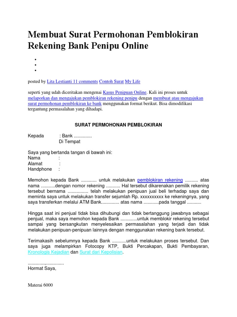 Contoh surat permohonan pemblokiran rekening. Permohonan Pencabutan Pemblokiran Rekening Prihal. Membuat Surat Permohonan Pemblokiran Rekening Bank Penipu Online Step By Step Membuat Surat Permohonan Pemblokiran Rekening Penipu Nya S Sweet Escape Doc Surat Permohonan Pemblokiran Docx Fahad Prayudhi Academia Edu. Sy tertipu oleh orang yang mengaku dari oegadaian syariah online melalui akun instagram dan rekannya yg mengaku petugas cukai pengiriman barang total senilai 5435000 mereka menggunakan bank BTPN sy mengajukan permohonan pemblokiran bermaterai 6000 bukti chat bukti percakapan telepone bukti transfer bill serta surat dr kepolisian.