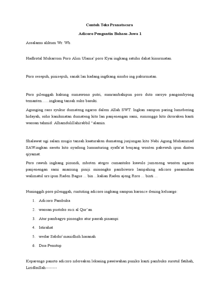 Dapatkan contoh teks pranatacara bahasa jawa untuk berbagai keperluan seperti temanten sripah pepanggih dinas dan lain sebagainya. - 5 Menit yang Menginspirasi. Pranoto coro Kawula nuwun Panjenenganipun para alim para kyai ingkang rinten dalu tansah sumanding kitab suci wahyuning illahi mirungganipun.